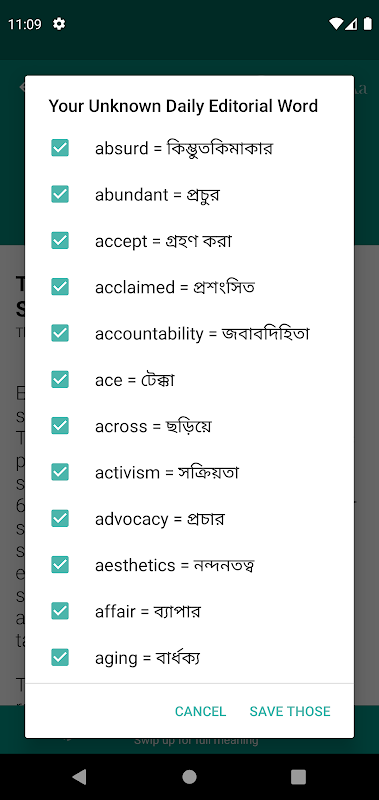 DICTIONNAIRE HORS LIGNE ET EN LIGNE (ANGLAIS VERS HINDI ou BENGALI), VOCABULAIRE ÉDITORIAL 10 000, CRÉER ET LIRE DAY WISE VOCABULAIRE ÉDITORIAL, SYNONYME, PARTIES DU DISCOURS, EXEMPLES DE PHRASE DU CORPUS, ÉTUDE PLANIFIER LE VOCABULAIRE, QCM QUIZ SUR LE VOCABULAIRE, LECTEUR D'ARTICLE, ENREGISTRER L'ARTICLE et RECHERCHER LE VOCABULAIRE.