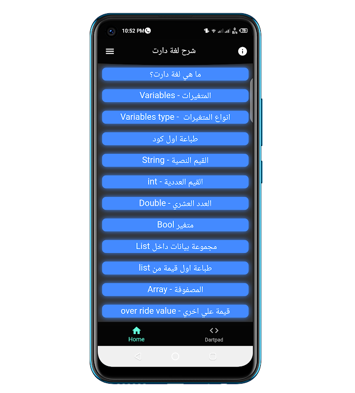 La première application explique la langue de la fléchette en arabe Passez un examen et obtenez un certificat