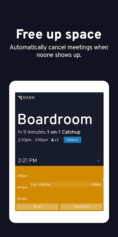 Réduisez le temps passé à chercher un lieu de rencontre et maximisez la collaboration avec Dash, le système simple d'affichage et de réservation de salle de réunion. Voyez instantanément ce qui se passe dans votre salle de réunion, réservez-la si elle est gratuite ou trouvez un autre espace à proximité si elle est pleine.