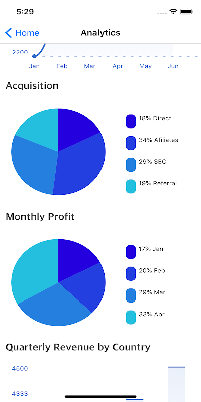 Download this admin dashboard app written in React Native to test out our beautiful fully functional React Native Dashboard app. The app is integrated with Firebase Auth & Firestore backend. It has screens for dashboards, charts, analytics, sales feed, etc.