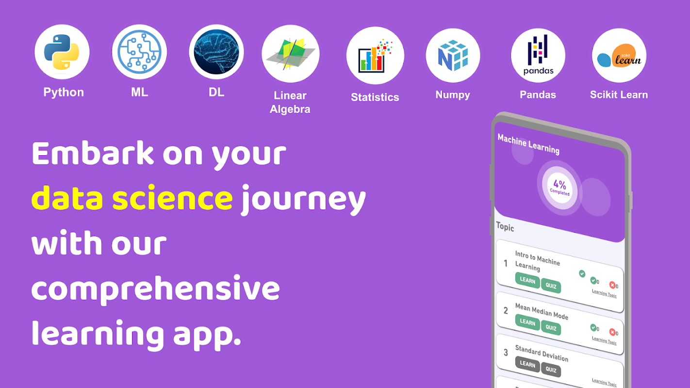 Bienvenue dans Data Science Mastery, votre guide complet pour maîtriser l'art de la science des données ! Que vous soyez débutant ou que vous cherchiez à améliorer vos compétences, notre application est conçue pour vous faire voyager des fondamentaux aux concepts avancés.