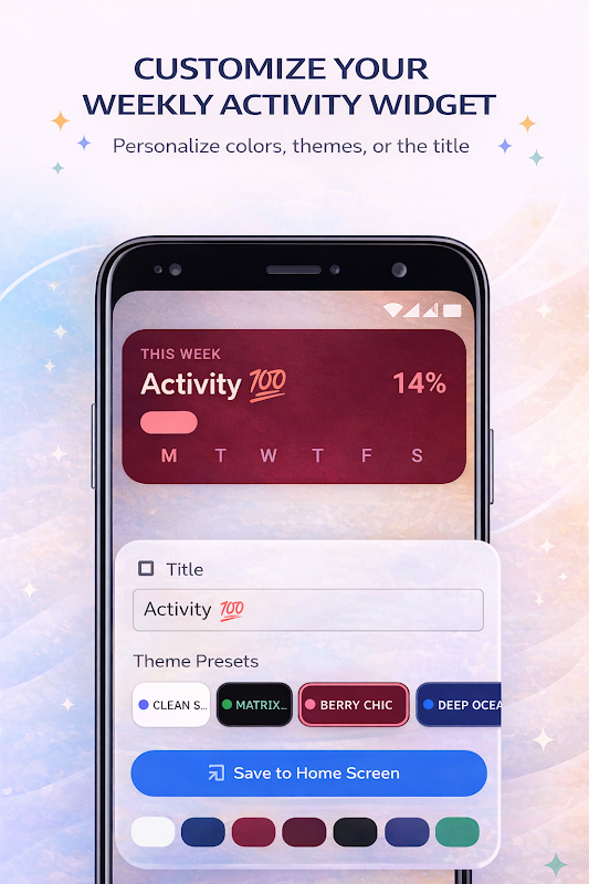 Installez l’application, ajoutez le widget, personnalisez votre design et commencez le suivi en quelques secondes.