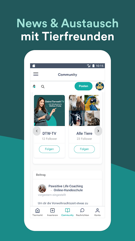 Dans notre communauté, vous pouvez réseauter avec nous et d'autres amoureux des animaux. Vous avez besoin de conseils, de conseils et vous cherchez l'inspiration? Vous le trouverez ici! Dans votre flux personnel, vous pouvez également découvrir les dernières nouvelles du monde animal: Nous partageons avec vous nos derniers articles de magazines, guides, podcasts et vidéos de DeineTierwelt TV. Et tout cela toujours à portée de main dans votre poche!
