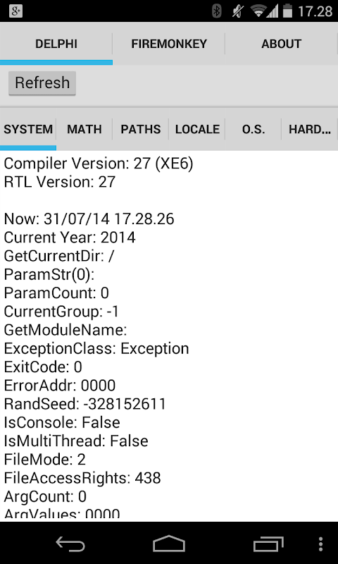 Created with Embarcadero RAD Studio XE6 using FM Multi Device cross-platform framework, this application shows all global variables and class properties from all System units and all FireMonkey platform services and "manager" classes.