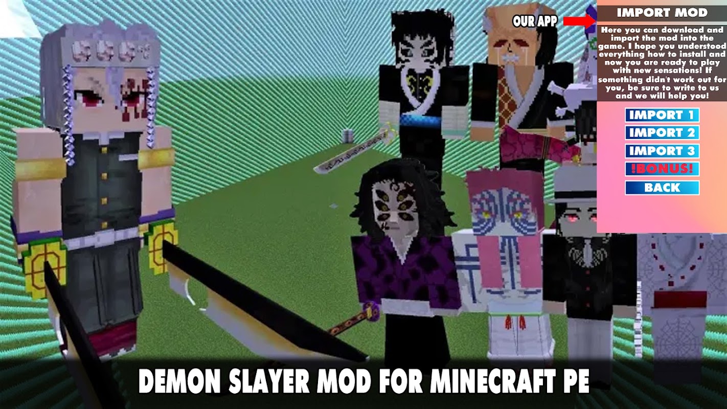 ❗❓Demon Slayer Mod pour Minecraft PE❗❓😋 Le mod Demon Slayer est dédié à l'anime du même nom. Minecraft aura de nouveaux monstres sous la forme de personnages de manga, d'armes, de vêtements et bien plus encore. L'add-on fonctionnera même en multijoueur, alors appelez vos amis et équipez-vous de nouveaux types d'armes pour combattre les mobs.😋