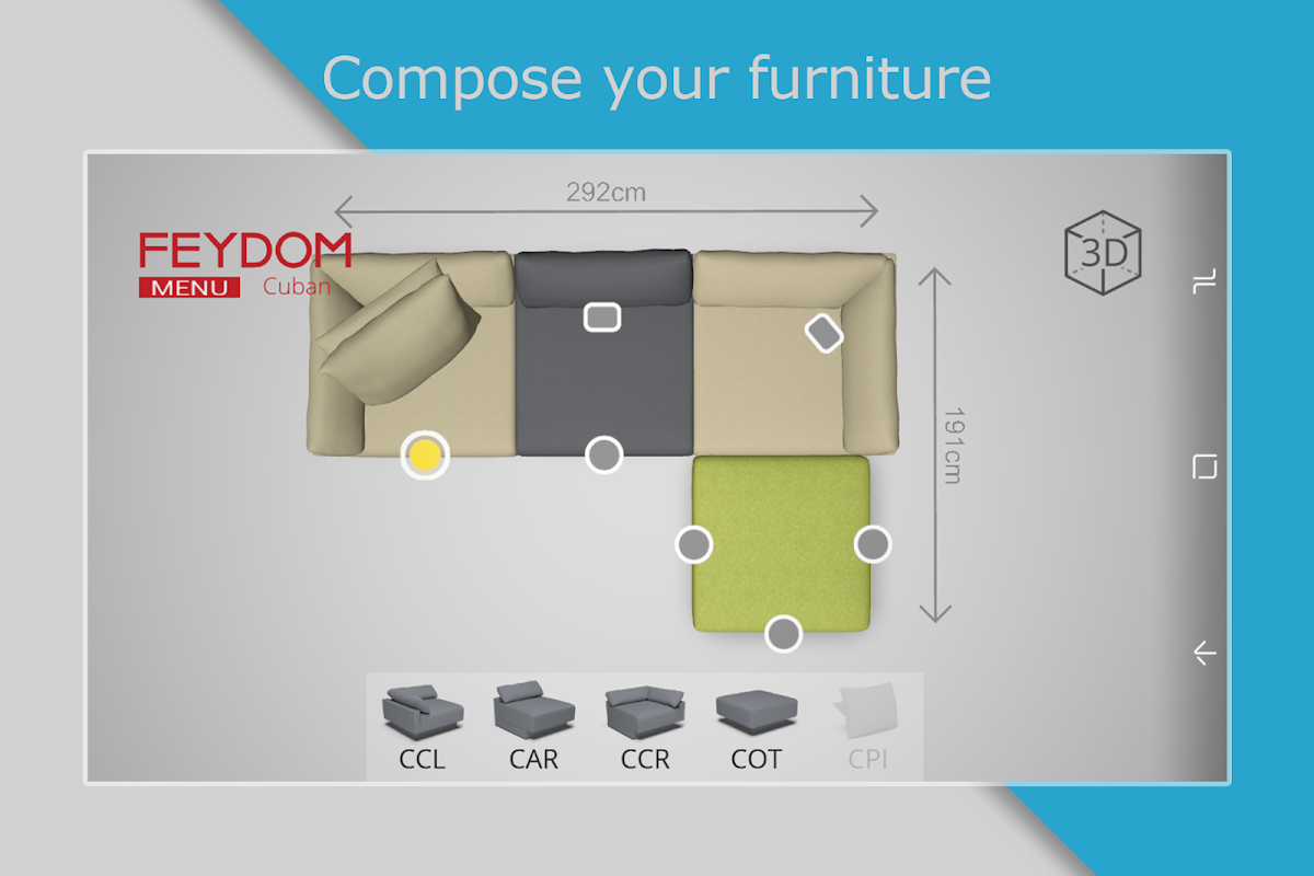 The Android app helps you to create a FEYDOM sofa set customized for the interior of your home by using the latest 3D technology. Choose a model and add its components to your choice.
