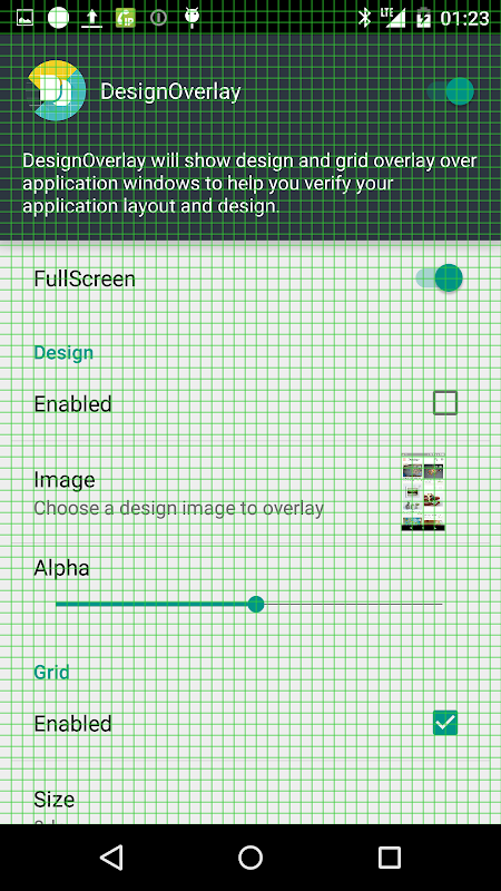 Shows a design image overlay w/ grid which helps you to verify your app design