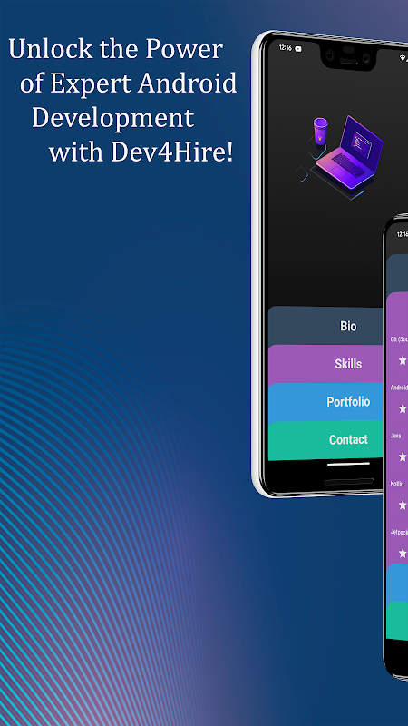 En tant qu'ingénieur Android chevronné avec plus de 9 ans d'expérience, je mets une technologie de pointe à votre portée. Téléchargez Dev4Hire pour explorer un portefeuille d'applications hautes performances et nous contacter pour vos besoins en applications personnalisées. Voici à quoi vous pouvez vous attendre :