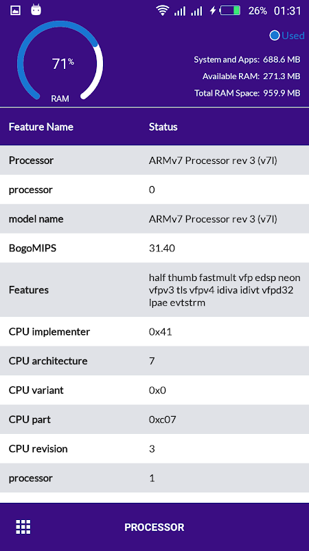 - Memory: Real RAM usage, Information about all available storage areas