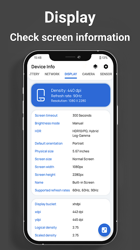 👉Écran : affiche des détails sur la résolution, la densité, la taille physique, la mise à l'échelle des polices, les taux de rafraîchissement pris en charge, les niveaux et les modes de luminosité et les informations de temporisation de l'écran.