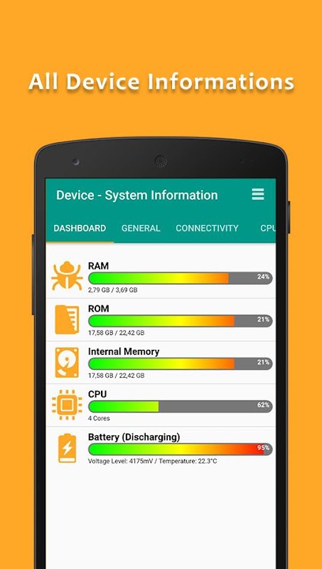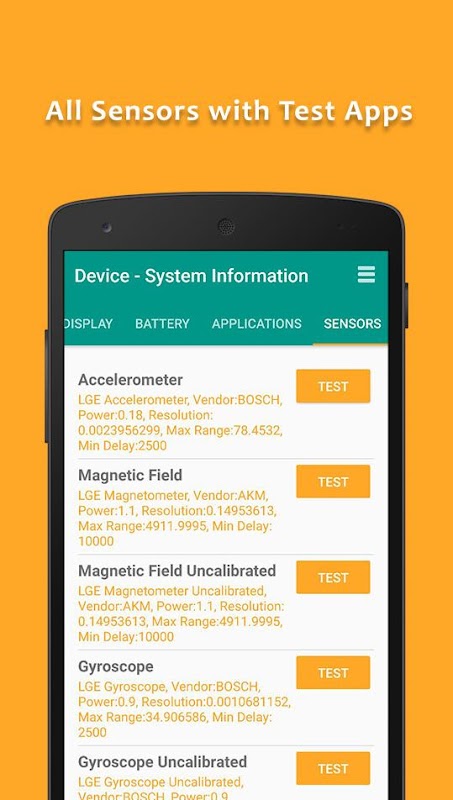 Il essaie de détecter les composants de votre smartphone pour fournir des informations complètes sur le matériel de l'appareil. Maintenant, la détection est prise en charge pour les écrans LCD, écran tactile, des capteurs, de la mémoire, le stockage, la batterie et wi-fi etc qui est possible pour votre appareil.