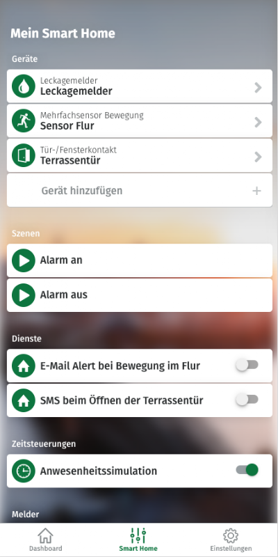 Wenn Sie Ihr System mit smarten Komponenten erweitern, dann können Sie zusätzlich in der App ganz schnell & intuitiv einzelne Geräte wie z.B. Licht, Rollladen und Heizung steuern, aber auch vor-konfigurierte Szenarien abspielen, wie z.B. das Alarmsystem beim Verlassen der Wohnung aktivieren.