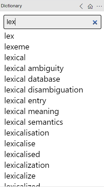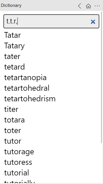 Pendant que vous tapez, Dictionary se positionne sur le mot que vous recherchez. Vous pouvez ensuite suivre les liens sur la page de définition pour obtenir davantage de définitions. Les caractères génériques peuvent être utilisés pour vous aider dans les jeux de mots comme les mots croisés et le Scrabble, lorsque vous ne connaissez que certaines lettres, ou pour trouver des anagrammes ou des mots à épeler. Les définitions incluent des synonymes et des antonymes, ce qui permet au dictionnaire de servir également de thésaurus. La fonction vocale vous aide à obtenir la prononciation correcte. Utilisez le thème de votre appareil ou choisissez un thème clair ou sombre avec des couleurs personnalisées.
