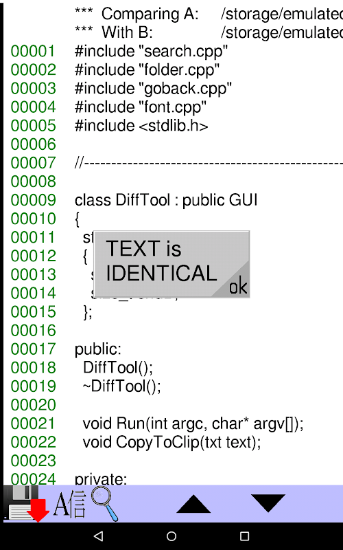 DiffTool est également un visualiseur de code source idéal permettant à tous les développeurs de vérifier leurs modifications en C, C ++, HTML, PHP, C4droid *, Python ® **, AIDE ***, Java ® **** et tout autre code source.