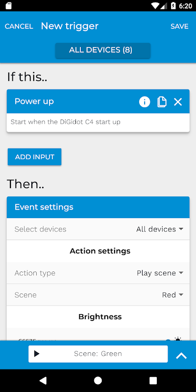 Une fois que vous avez les scènes sur votre microSD, il existe plusieurs façons de démarrer des scènes, en dehors de l'application Playback. Pour ce faire, vous devez ajouter des déclencheurs. Le C4 dispose de plusieurs types de déclencheurs. Par exemple, vous pouvez choisir une scène au moment où le C4 démarre. Le C4 est également équipé d'une prise jack 3,5 mm, qui permet d'envoyer une entrée analogique au C4. Des interrupteurs physiques ou même des capteurs de mouvement peuvent également être connectés. Des déclencheurs liés au temps peuvent être créés, de sorte qu'une scène spécifique sera affichée ou allumée et éteinte à des heures choisies. Le déclencheur 'HTTP' permet de déclencher des scènes avec une requête HTTP.