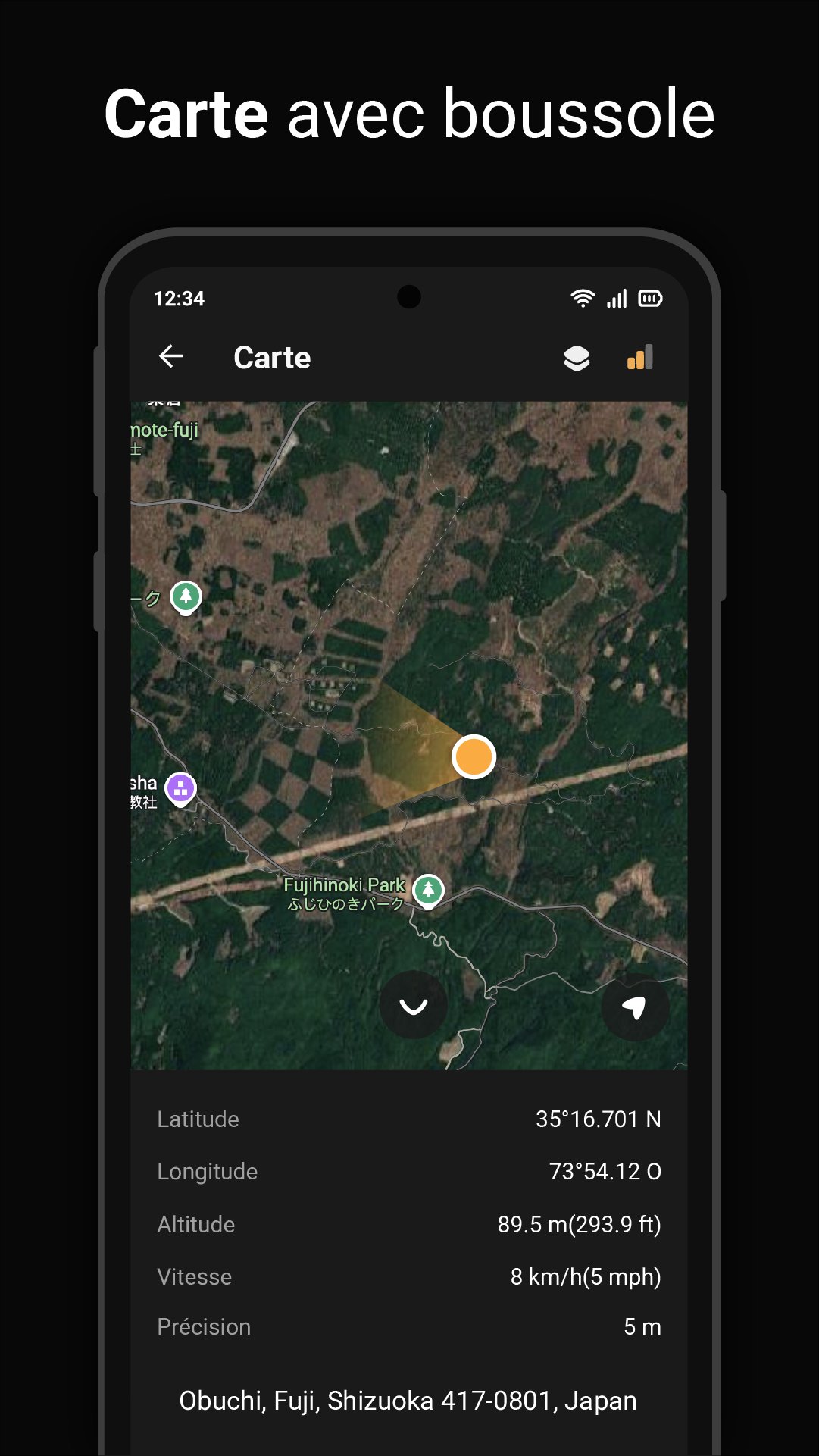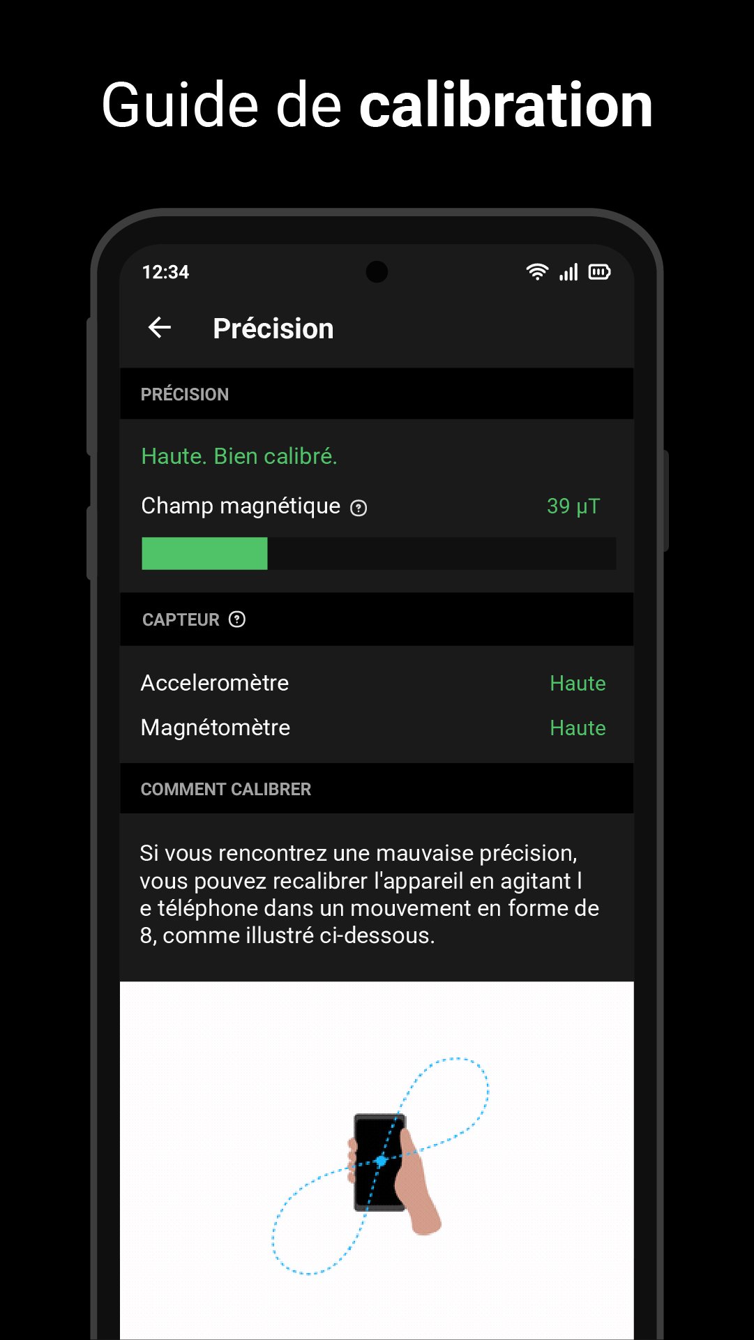 Cette application utilise le magnétomètre, le gyroscope et les capteurs GPS de votre téléphone pour garantir des résultats fiables. Pour fonctionner correctement, l’appareil doit disposer d’un magnétomètre et d’un accéléromètre.
