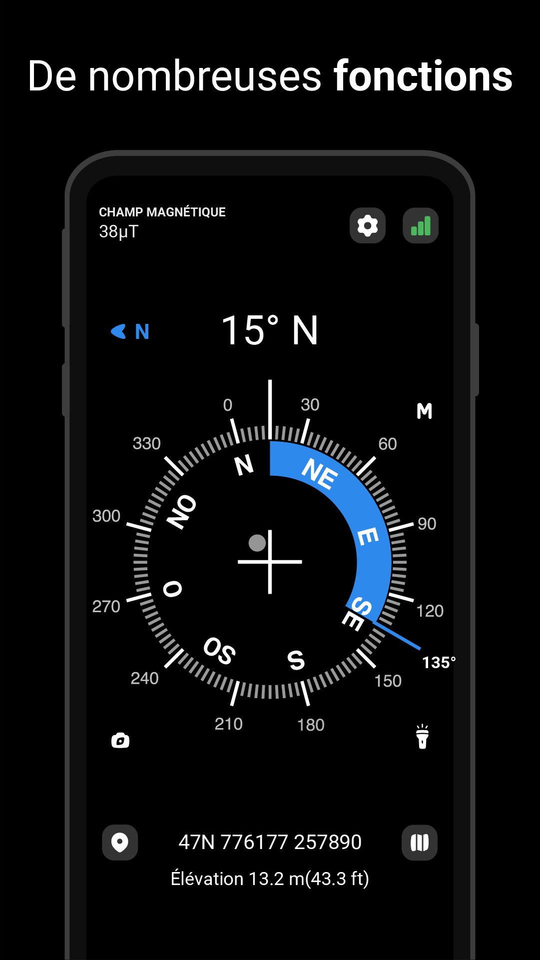 Utilisez la boussole GPS pour connaître votre position, mesurer l’altitude (altimètre) et surveiller la force du champ magnétique autour de vous. La lampe torche intégrée vous aide lors de vos déplacements de nuit ou dans les lieux sombres.