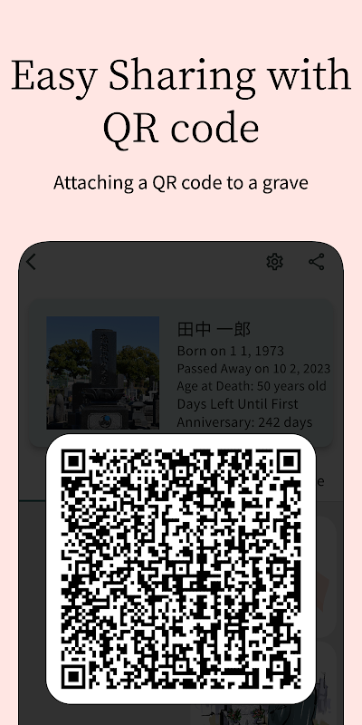 Avec cette application, vous pouvez créer en ligne des tombes pour vos proches décédés et vos animaux de compagnie. Il vous permet de rendre hommage à la tombe en ligne et de vérifier et de définir des notifications pour les dates des services commémoratifs. En plaçant des codes QR sur de véritables tombes, vous pouvez offrir à de nombreuses personnes la possibilité de visiter et de rendre hommage.