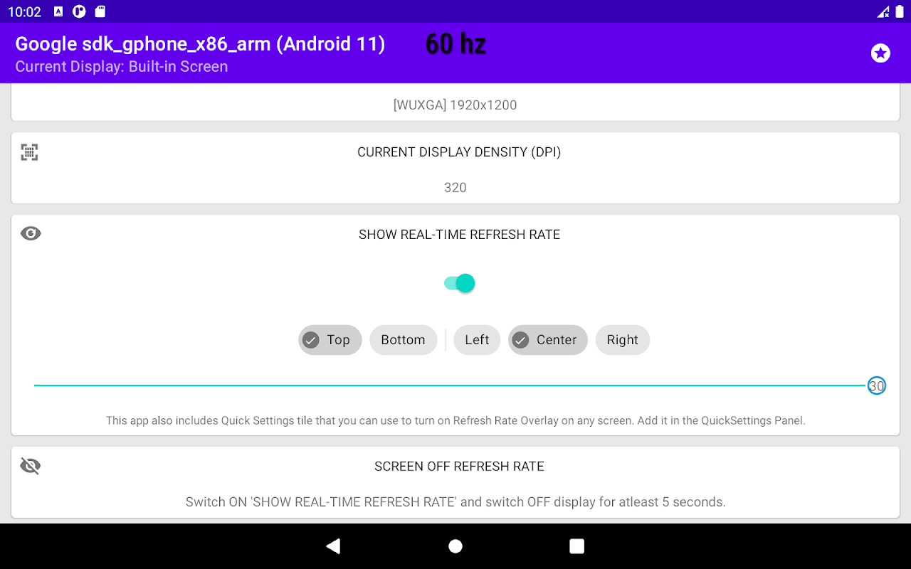 - Taux de rafraîchissement de l'affichage en temps réel avec taille et emplacement personnalisables. Consultez les taux de rafraîchissement de votre écran en temps réel sur les appareils prenant en charge les taux de rafraîchissement variables / multiples / dynamiques.