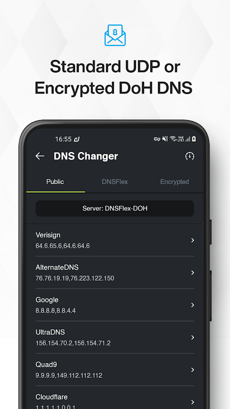 * Prend en charge le DOH crypté (DNS sur HTTPS) et le DNS UDP