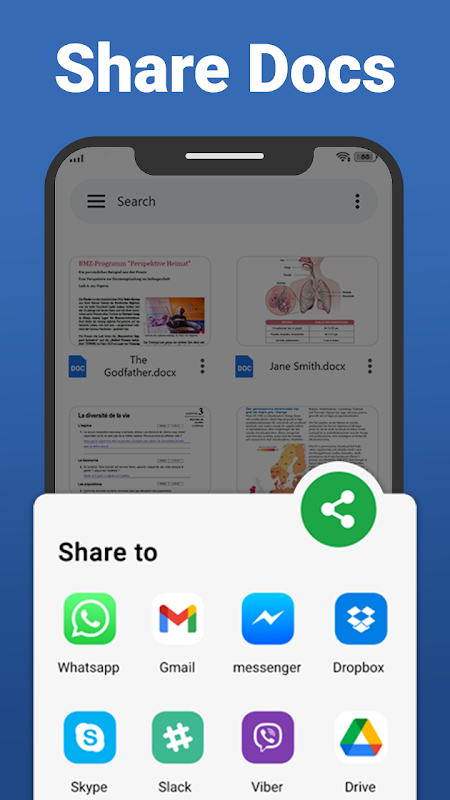 une interface facile à utiliser qui permet aux utilisateurs de visualiser tous les fichiers Word à partir du gestionnaire de fichiers ou directement à partir de l'application. Lecteur Docx - word office app est un outil recommandé pour vous. il vous permet de lire des docs sur votre téléphone n'importe où, n'importe quand très rapidement. Le lecteur de docs pour Android est le moyen le plus rapide de lire des docs Word sur votre appareil. word app est conçue pour gérer, afficher et lire facilement tous les docs. Vous pouvez parcourir tous vos fichiers Doc / Docx en un seul endroit avec un lecteur et un éditeur de docs. ce lecteur et visualiseur de tous les docs vous permet d'ouvrir des docs stockés dans la mémoire interne ou sur des cartes SD. En outre, les fichiers téléchargés ou envoyés sous forme de pièces jointes à un e-mail. Trouvez maintenant rapidement n'importe quel fichier Docx souhaité avec l'option de recherche simple.