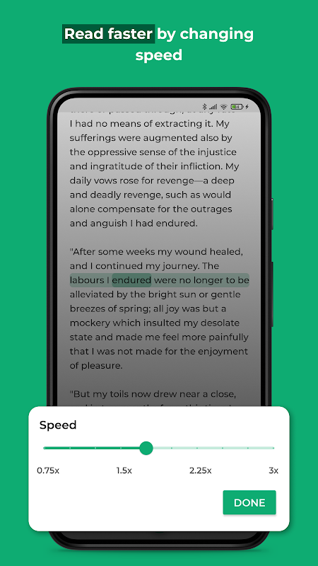 DocSpeech est parfait si vous voulez terminer rapidement la lecture d'un livre avec un minimum de distraction. Notre moteur vocal basé sur l'IA génère une voix semblable à celle d'un humain et ressemble à un livre audio plus la mise en surbrillance des mots.