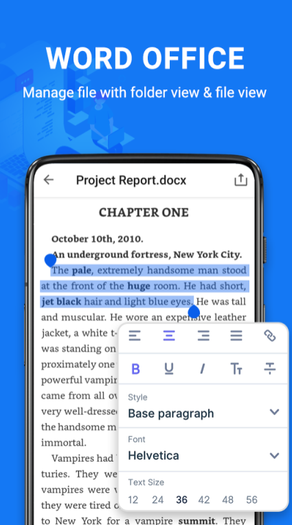 • Word Office Editor can edit documents like ms word office docx file, edit XLSX of excel files, PPTX of Slide