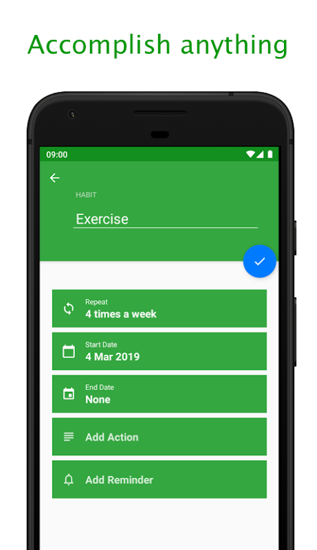 Suivre toutes les habitudes que vous voulez. De se lever plus tôt, la méditation, à l'exercice et à la lecture plus. Définissez la fréquence à laquelle l'habitude doit être répétée. Choisissez parmi tous les jours, certains jours de la semaine ou plusieurs fois par semaine. Les habitudes peuvent être hautement personnalisables.