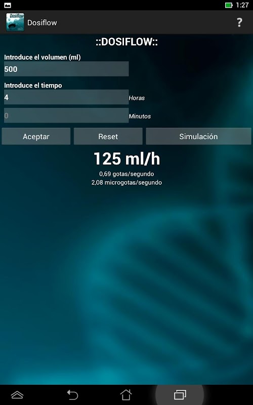 Dosiflow es una herramienta de ayuda para el cálculo rápido de la velocidad de infusión de una dilución. Introduciendo el volumen y el tiempo expresa el resultado en mililitros/hora.