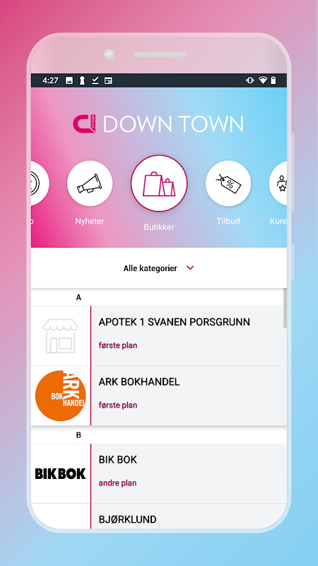 Mobilappen til Down Town kobler dine personlige fordeler med den siste informasjonen om butikkene, nyhetene og arrangementene i kjøpesenteret.
