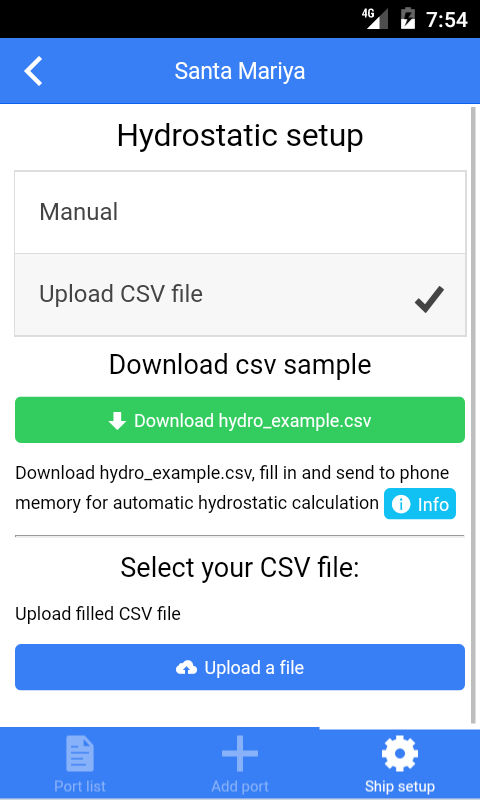 Il y a une possibilité de calcul manuel et automatique des données hydrostatiques en ajoutant un fichier csv. Tout ce que vous devez automatiser le calcul de Hydrostatics - télécharger un fichier vide du programme, remplissez-le sur l'ordinateur avec les données de votre navire et télécharger le fichier à travers le programme.