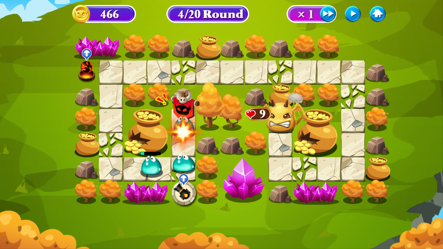 In the game, the player needs to build a defense tower on the monster's marching route,