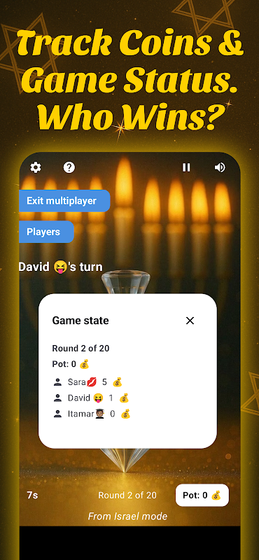 Allumez les bougies, prenez des pièces en chocolat (gelt), choisissez le mode solo ou multijoueur et laissez tourner la toupie en cristal ! – en mode Israël, hors d'Israël ou les deux.