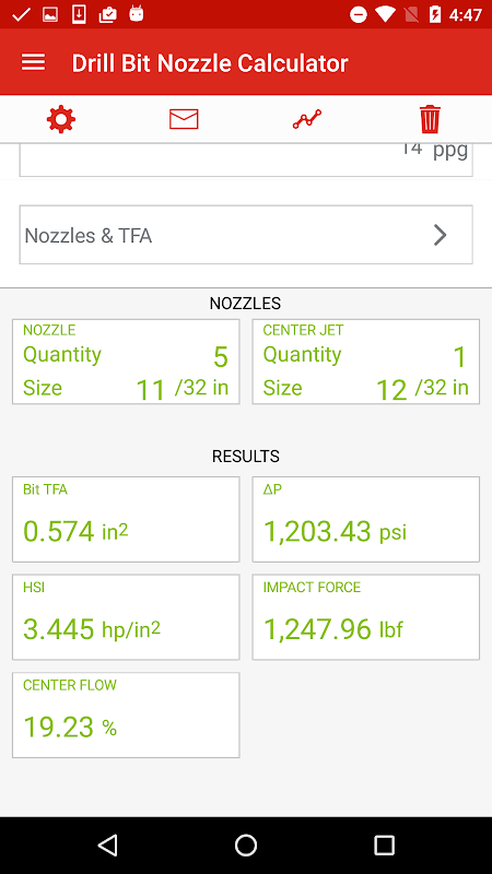 Obtenez rapidement des résultats de buses tels que la chute de pression, Bit TFA, HSI, force d'impact, etc.
