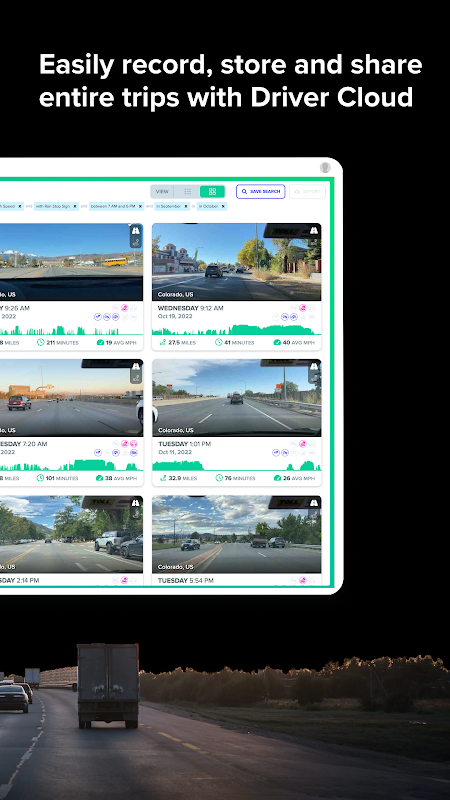 Telematics et Dash Cam sont automatiquement téléchargés sur Driver Cloud pour une visualisation et une gestion faciles sur n'importe quel navigateur ou appareil mobile. Partager un voyage avec votre assurance, votre patron ou votre famille est aussi simple que d'envoyer un lien URL vers votre voyage sur Driver Cloud.