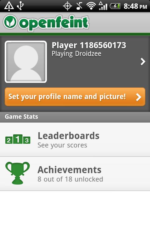 ICE CREAM SANDWICH (Android 4.0) - OpenFeint does not always work correctly. They are aware of the issue and as soon as it's fixed, we will update Droidzee with the new fix. We are sorry for the inconvenience.
