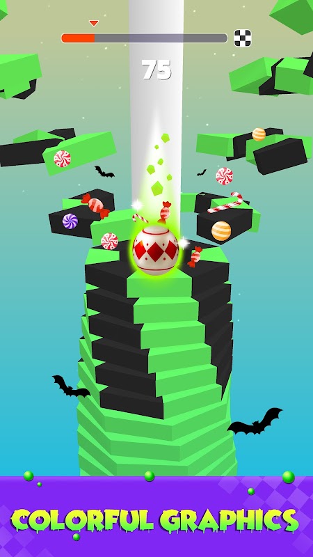 Press and hold on the screen to let the ball fall down so that the ball doesn't touch the black stacks! Hold for as long as possible to break all blocks and overcome the obstacles, through revolving helix platforms to reach the end 👌