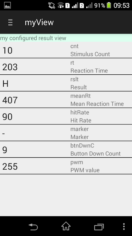 * Config myView: vous permettent de configurer comment et ce que vous voulez voir des messages de l'Arduino d'état. Les éléments de données peuvent être affichées sur votre myView individualy configuré et / ou dans une fenêtre pop-up (toasts).