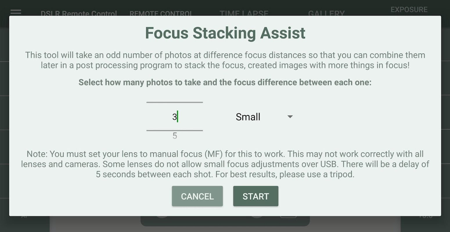 DSLR Control + dispose d'un outil unique d'assistance à l'empilage de la mise au point, qui vous permet de prendre automatiquement un nombre défini de photos avec une variation variée de la mise au point, de manière à pouvoir les empiler ultérieurement lors du post-traitement.
