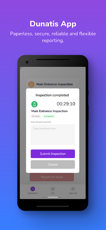 Dunatis utilise des appareils mobiles pour enregistrer facilement les inspections physiques associées à des rapports en direct et historiques. Vous permet d'économiser du temps, de l'argent et des amendes potentielles.