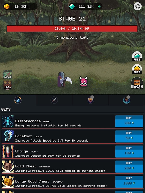 Toutes les fonctionnalités inactives incrémentales bien connues, avec une musique relaxante, de superbes graphismes pixelisés à l'ancienne et des éléments de RPG. Affrontez des monstres et des boss, collectez des reliques et faites progresser votre guerrier dans ce RPG mobile épique en combat automatique.