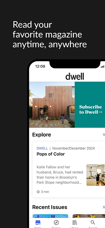 L'application Dwell est téléchargeable gratuitement et vous permet d'acheter des numéros numériques de Dwell Magazine. Vous pouvez acheter des numéros uniques pour 9,99 USD ou vous abonner pendant 1 an pour obtenir 6 numéros numériques pour 19,99 USD.