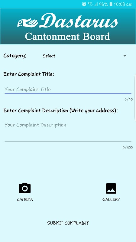 e-Dastarus has been created for the submission and management of cantonment residents complaints. The Android application has been divided into different categories for registering complaints such as: