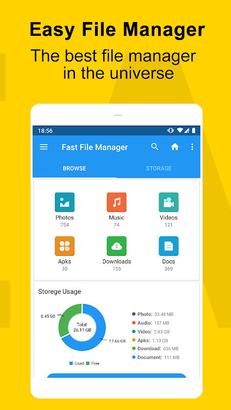 Easy File Manager is a powerful Android file manager, clear classification allows you to find pictures, video, music, documents, installation packages, compressed packages and other files quickly, supporting global search, delete, create, copy, cut, rename, share and other file operation functions on the mobile phone memory and SD card. We also provide a convenient garbage collection function, so you can easily clean up the excess files, folders and application cache on the phone.