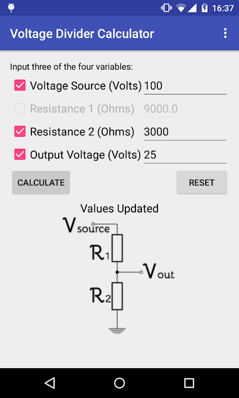 For the more convenient ad-free version: https://play.google.com/store/apps/details?id=barwick.voltagedividercalc