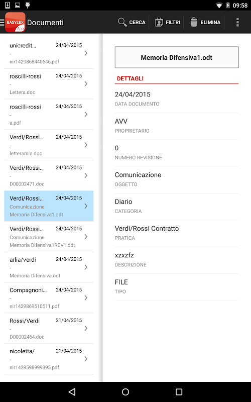 L'applicazione permette in modo intuitivo di consultare e gestire i propri contatti e quelli dello Studio, gli appuntamenti personali e dei collaboratori, il da fare (attività), la gestione delle udienze, i documenti e le pratiche.