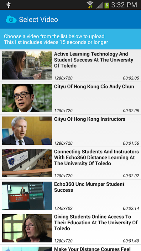 The Echo360 Mobile Upload app is an easy way for instructors and students at current Echo360 client institutions to add new video content to their courses for review and assessment. Instructors can capture video outside the classroom with their Android device, upload and share with their classes. Students can capture their projects and submit as assignments for instructor and peer review.