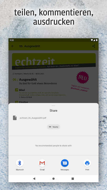Eine Sharing-Option wurde hinzugefügt, welche den Dateien sinnvolle Namen gibt und es erlaubt die PDFs zu teilen oder auszudrucken.