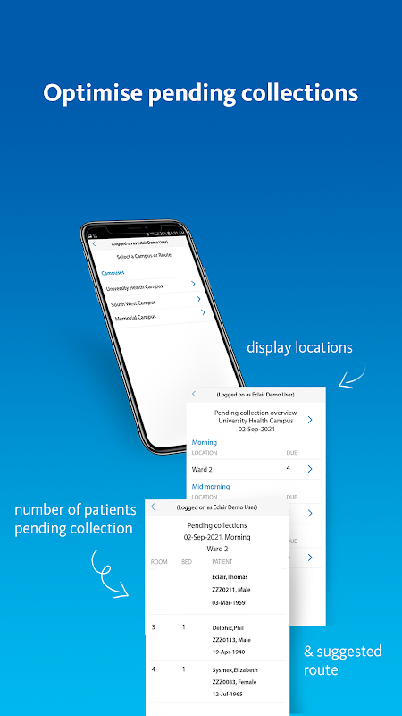 EclairTouch Collects est une application de gestion de collecte dédiée développée pour aider les phlébotomistes dans le flux de travail de collecte d'échantillons. Il est conçu pour :