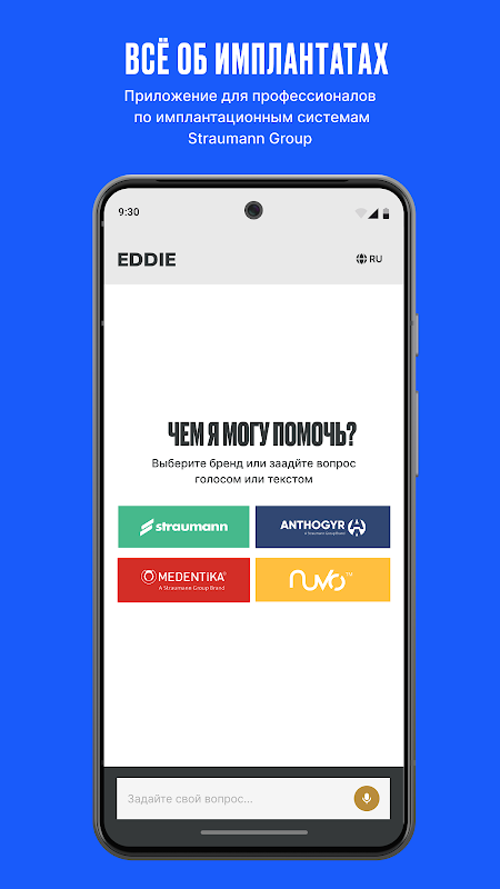 EDDIE est un assistant intelligent pour dentistes, chirurgiens, orthopédistes et implantologues, qui permet de trouver rapidement des informations sur les produits des marques Straumann, Anthogyr, Nuvo et Medentika.